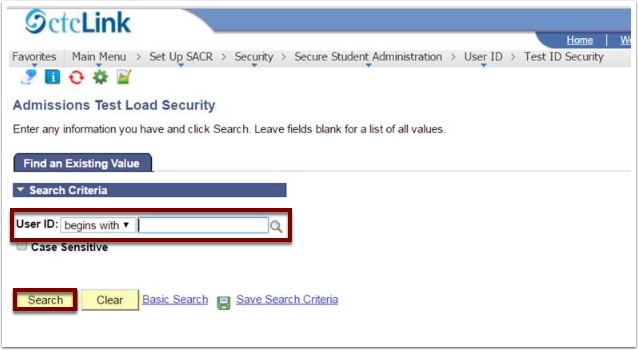 To establish Test ID Security, navigate to the Test ID Security page and enter the EMPLID of the user your would like to grant access to.
