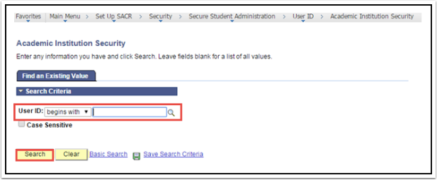 Navigation: NavBar > Set Up SACR > Security > Secure Student Administration > User ID > Institution/Campus Security