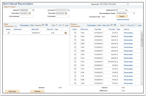 Note: If the reconciliation status selected is Reconciled, this page displays both bank transactions and system transactions that are reconciled by semi-manual or automatic reconciliation. Transactions reconciled from the Manual Reconciliation page are also displayed here, but can only be unreconciled from the Manual Reconciliation page.
