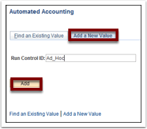 - Enter an existing Run Control ID or click the Add a New Value tab on the Automated Accounting page to add a new value.
