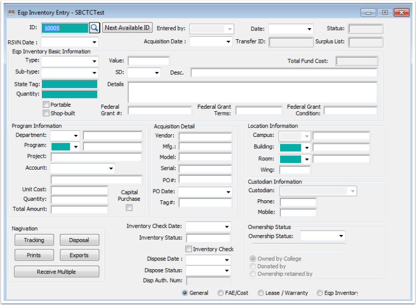 - Eqp Inventory Entry screen will open for a new item with next ID number pre-populated.