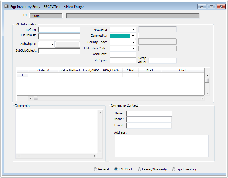 - Click FAE/Cost radio button at the bottom of the General tab screen to move onto the FAE/Cost screen.