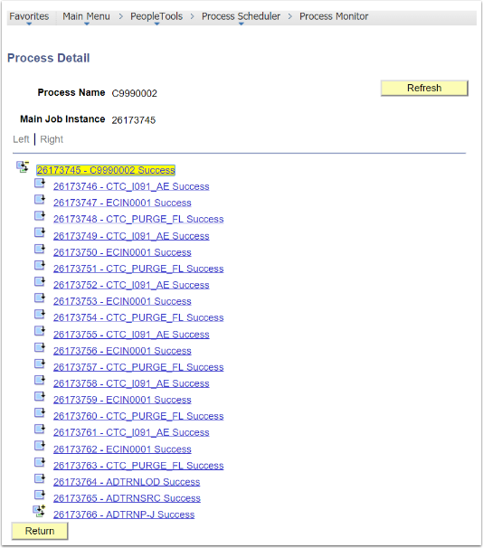 Multiple processes can be combined into a JobSet. In order to review the details of how each process within your JobSet ran, you must first select the link under the Process Name column. After a job is submitted using the Process Scheduler Request page or your scheduled job is triggered, use Process Monitor to review the status of scheduled or running processes.